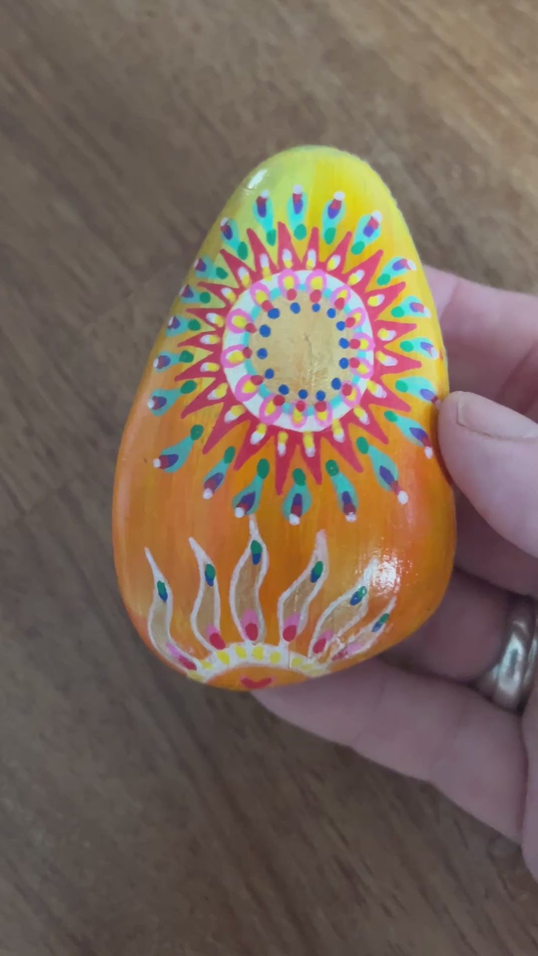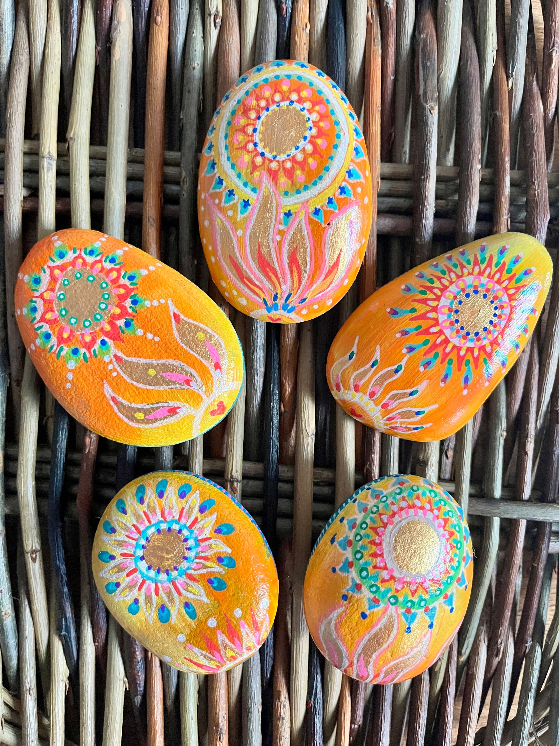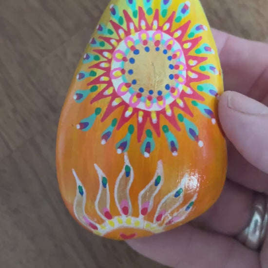 These hand-painted pebbles are midsummer touchstones — made to hold the heat of the sun, the spark of transformation, and the blessing of sacred fire.